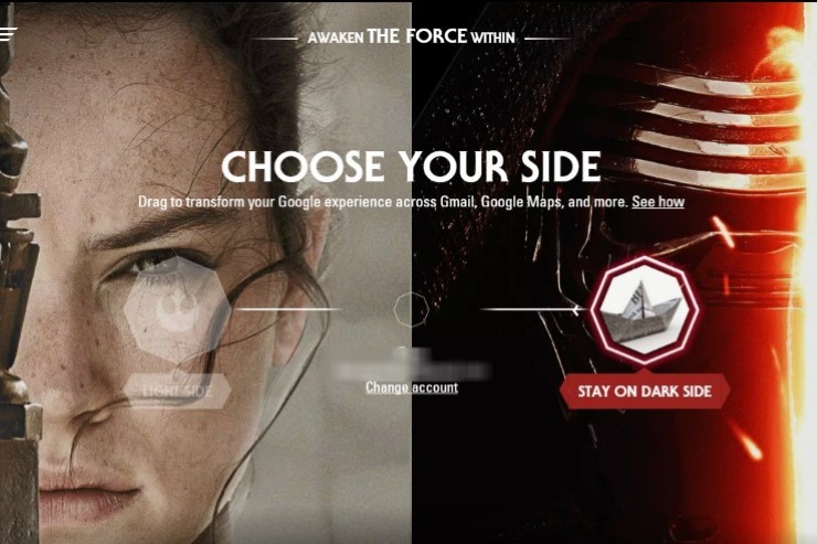 ใกล้เข้าวันฉายภาพยนตร์ภาคต่อที่ทั่วโลกรอคอยอย่างเรื่อง Star Wars : The Force Awakens ทุกที ล่าสุดทาง'กูเกิล'จึงสร้างกระแสโปรโมทภาพยนตร์โดยการให้ผู้ใช้บัญชีกูเกิลทุกท่านสามารถเลือกฝ่ายระหว่าง "ด้านมืด" หรือ "ด้านสว่าง" ดั่งเช่นในภาพยนตร์ได้