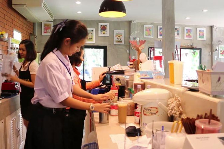 “เราคัดเลือกเด็กที่ค่อนข้างขาดแคลนในการให้โอกาสมาทำงานตรงนี้ และได้รับการสนับสนุนจากนักเรียนในโรงเรียนในการเลือกซื้อสินค้าและเครื่องดื่ม มีทั้งชา กาแฟ น้ำปั่น น้ำผลไม้ต่างๆ รวมทั้งมีผลิตภัณฑ์ที่นักเรียนทำมาเพื่อวางจำหน่าย หารายได้เสริม อาทิ ขนมปัง แซนด์วิช คุกกี้ ฯลฯ โดยได้ผ่านการตรวจจากทางคณะครูของโครงการแล้วว่าเป็นสินค้าที่มีคุณภาพ ใหม่ สะอาด มีประโยชน์”