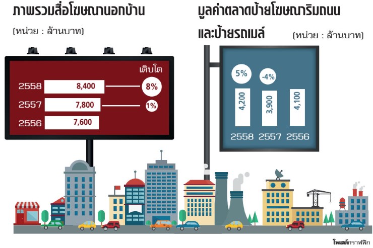 จากแนวโน้มที่เกิดขึ้นประกอบกับผู้ประกอบการสินค้าและเอเยนซีหันมาโยกการใช้งบจากสื่อทีวีและสิ่งพิมพ์มาใช้กับสื่อออนไลน์และสื่อนอกบ้านมากขึ้น จึงทำให้มีการคาดการณ์ว่าภาพรวมธุรกิจสื่อนอกบ้านในปีนี้น่าจะมีอัตราการเติบโตมากกว่าปี 2558 ซึ่งภาพรวมสื่อนอกบ้านมีอัตราการเติบโตอยู่ที่ประมาณ 8% หรือมีมูลค่าอยู่ที่ประมาณ 8,400 ล้านบาท แบ่งเป็นสื่อนอกบ้านประเภทสื่อเคลื่อนที่ 4,200 ล้านบาท และสื่อป้ายโฆษณาตามถนนและป้ายรถประจำทาง 4,200 ล้านบาท