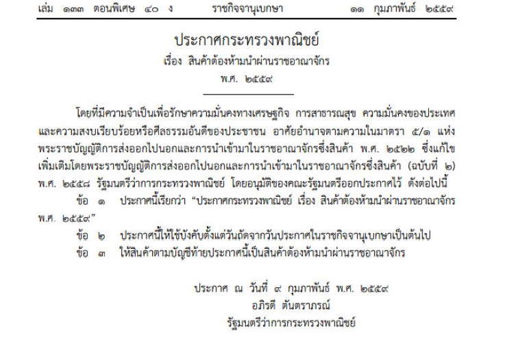 เมื่อวันที่ 11 ก.พ. ราชกิจจานุเบกษา ได้เผยแพร่ ประกาศกระทรวงพาณิชย์ เรื่อง สินค้าต้องห้ามนําผ่านราชอาณาจักร พ.ศ.2559 ลงนามโดย นางอภิรดี ตันตราภรณ์ รัฐมนตรีว่าการกระทรวงพาณิชย์ มีเนื้อหาดังนี้