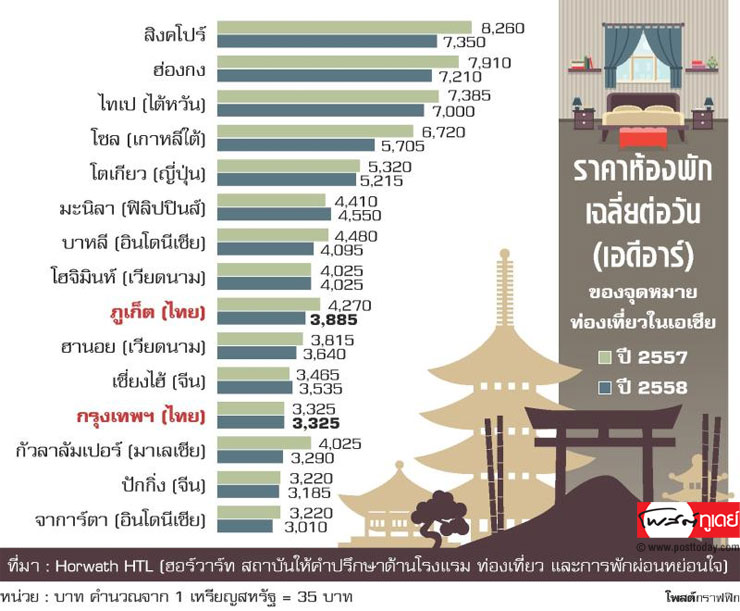 ฮอร์วาร์ท สถาบันให้คำปรึกษาด้านโรงแรม ท่องเที่ยว และการพักผ่อนหย่อนใจ ได้สำรวจราคาห้องพักเฉลี่ยต่อวัน (เอดีอาร์) ของจุดหมายท่องเที่ยวในเอเชียปีที่ผ่านมา ซึ่งหากนำจุดหมายหลักๆ ในเอเชียมาเทียบกัน ราคาห้องพักในไทยค่าพักแค่ 50% ของสิงคโปร์ ฮ่องกง และไทเป (ไต้หวัน) ยังต่ำกว่าโซล (เกาหลีใต้) โตเกียว (ญี่ปุ่น) มะนิลา (ฟิลิปปินส์) บาหลี (อินโดนีเซีย) โฮจิมินห์ (เวียดนาม) แต่สูงกว่ากัวลาลัมเปอร์ (มาเลเซีย) ปักกิ่ง (จีน) จาการ์ตา (อินโดนีเซีย) เล็กน้อย และเมื่อมีมาตรการรัฐเสริม ยิ่งทำให้เที่ยวไทยคุ้มค่าขึ้นไปอีก