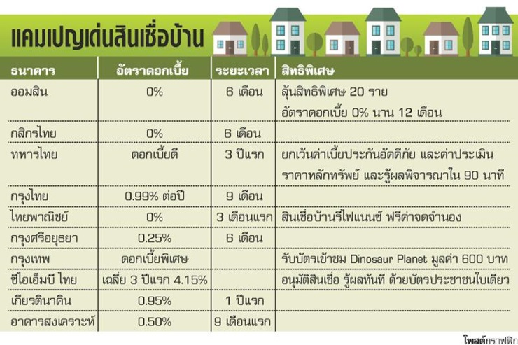ทั้งนี้ สินเชื่อที่ได้รับความนิยมอันดับ 1 ทุกปี คงหนีไม่พ้นสินเชื่อบ้าน ซึ่งปีนี้พบว่าโปรโมชั่นสินเชื่อบ้าน 0% เริ่มกลับมาอีกครั้ง หลังจากห่างหายไปหลายปี เนื่องจากธนาคารแห่งประเทศไทย (ธปท.) ได้ขอให้งดเว้นไว้ก่อนหน้านี้ เนื่องจากเกรงว่าอัตราดอกเบี้ยที่ต่ำเกินไปจะเป็นการปั่นฟองสบู่ภาคอสังหาริมทรัพย์