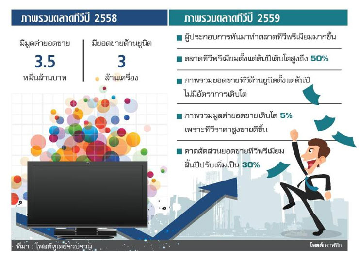ปัจจุบันภาพรวมตลาดทีวีของไทยมีมูลค่ายอดขายอยู่ที่ประมาณ 3.5 หมื่นล้านบาท และมียอดขายในด้านของจำนวนยูนิตอยู่ที่ประมาณ 3 ล้านเครื่อง ในจำนวนดังกล่าวเป็นทีวีระดับพรีเมียมประมาณ 25% ซึ่งจากการที่ทีวีระดับพรีเมียมมีการขยายตัวอย่างต่อเนื่อง ทำให้คาดการณ์ว่าสิ้นปีนี้สัดส่วนยอดขายทีวีพรีเมียมจะปรับเพิ่มขึ้นมาเป็น 30% อย่างแน่นอน