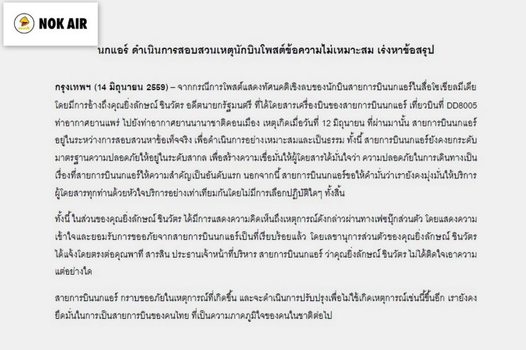 จากกรณีการโพสต์แสดงทัศนคติเชิงลบของนักบินสายการบินนกแอร์ในสื่อโซเชียลมีเดีย โดยมีการอ้างถึงน.ส.ยิ่งลักษณ์ ชินวัตร อดีตนายกรัฐมนตรี ที่ได้โดยสารเครื่องบินของสายการบินนกแอร์ เที่ยวบินที่ DD8005 ท่าอากาศยานแพร่ ไปยังท่าอากาศยานนานาชาติดอนเมือง เหตุเกิดเมื่อวันที่ 12 มิถุนายน ที่ผ่านมานั้น สายการบินนกแอร์ อยู่ในระหว่างการสอบสวนหาข้อเท็จจริง เพื่อดำเนินการอย่างเหมาะสมและเป็นธรรม