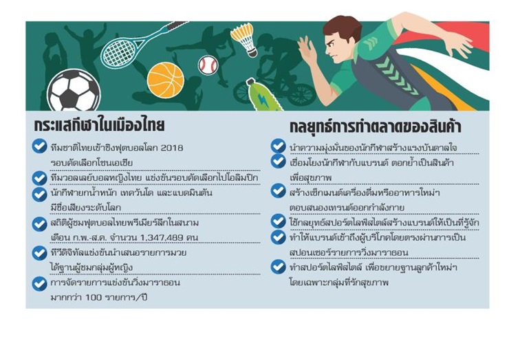 จากกระแสสปอร์ตไลฟ์สไตล์ที่มาแรง ทั้งการออกกำลังกายและพฤติกรรมคนไทยที่หันมาดูกีฬามากขึ้น ประกอบกับความสามารถของนักกีฬาไทยก้าวสู่ระดับโลก ล้วนเป็นช่องทางการทำธุรกิจใหม่ๆ รวมทั้งการสร้างแบรนด์ ถือว่าการทำสปอร์ตไลฟ์สไตล์เป็นอาวุธที่ทรงพลังในยุคนี้