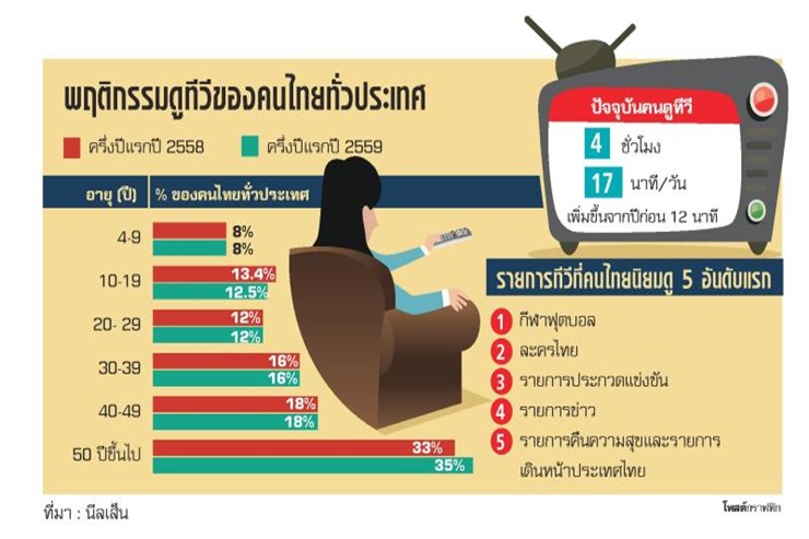 สินธุ์ เภตรารัตน์ กรรมการผู้จัดการ ธุรกิจมีเดีย บริษัท นีลเส็น (ประเทศไทย) กล่าวว่า ปัจจุบันสื่อนอกบ้านเพิ่มมากขึ้น รวมไปถึงสื่อประเภทอินเทอร์เน็ต และโฆษณาผ่านสื่อดิจิทัลทีวีเติบโตขึ้นอย่างเห็นชัด ปัจจุบันคนไทยดูทีวี 4 ชั่วโมง 17 นาที เพิ่มจากปีก่อน 12 นาที ซึ่งสิ่งที่น่าสนใจคือกลุ่มคนอายุ 10-19 ปี เริ่มดูทีวีลดลง ขณะที่คนอายุ 50 ปีขึ้นไป หันมาดูทีวีมากขึ้น และประชากรผู้สูงอายุในไทยมีแนวโน้มขยายตัวขึ้นด้วย ซึ่งไทยขณะนี้ผู้ที่มีอายุมากกว่า 65 ปี มี 10% ของประชากร คาดอีก 15 ปีจะเพิ่มเป็นเท่าตัว การผลิตสื่อหรือการทำรายการที่รองรับกลุ่มลูกค้าในช่วงอายุนี้จึงเป็นสิ่งที่น่าจับตา