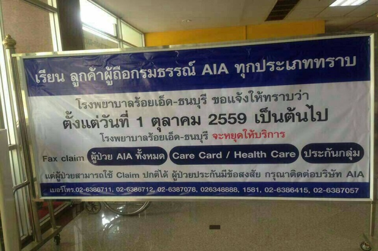 สื่อออนไลน์มีการแชร์ประกาศที่แจ้งถึงลูกค้าผู้ถือกรมธรรม์ AIA ทุกประเภททราบ ว่า โรงพยาบาลร้อยเอ็ด-ธนบุรี ขอแจ้งให้ทราบว่า ตั้งแต่วันที่ 1 ต.ค.2559 เป็นต้นไป จะหยุดให้บริการแฟกซ์เคลมผู้ป่วย AIA ทั้งหมด รวมถึงบริการแคร์การ์ด/เฮลท์ แคร์ และประกันกลุ่ม แต่ผู้ป่วยสามารถใช้เคลมปกติได้ ทำให้เกิดการตีความไปต่างๆ นาๆ
