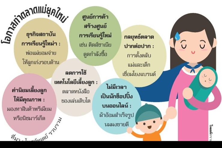 คุณแม่ยุคใหม่ กลายเป็นตลาดที่มีศักยภาพเติบโตสูงมาก จากไลฟ์สไตล์การใส่ใจดูแลลูกตั้งแต่อยู่ในครรภ์ จนกระทั่งเติบโตเป็นผู้ใหญ่ จึงเกิดการแข่งขันของธุรกิจเพื่อช่วงชิงกำลังซื้อ เริ่มตั้งแต่ลูกยังไม่ลืมตาดูโลกด้วยซ้ำ กลุ่มโรงพยาบาลก็นำเสนอแพ็กเกจคลอดลูก ประกันชีวิต สินค้าแม่และเด็ก ของเล่น และสถาบันสอนพิเศษต่างๆ