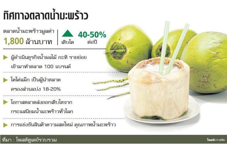 กระแสดื่มน้ำมะพร้าวเพื่อสุขภาพเกิดขึ้นในยุโรป อเมริกา และแพร่หลายมาสู่เมืองไทย จุดพลุให้ผู้ประกอบการเล็งเห็นถึงโอกาสการทำตลาดทั้งในประเทศและต่างประเทศ โดยประมาณการว่าในปี 2563 มูลค่าตลาดน้ำมะพร้าวทั่วโลกจะขยับไปแตะ 3.7 หมื่นล้านบาท โตปีละ 25% สำหรับในไทยอีก 5 ปี มูลค่าจะเพิ่มเป็น 5,000 ล้านบาท