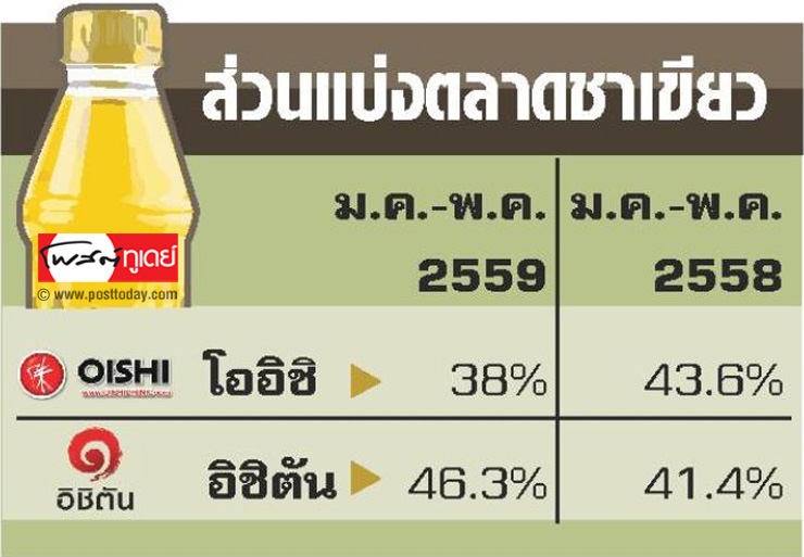 สำหรับส่วนแบ่งตลาด 5 เดือนที่ผ่านมา ในแง่คอร์ปอเรตแชร์โออิชิเพิ่มจาก 38% เป็น 43.6% ขึ้นมาเป็นอันดับ 1 ในเชิงมูลค่าโต 10.1% เกินเป้าหมายที่ตั้งเป้าโต 5% ส่วนอิชิตันส่วนแบ่งจาก 46.3% เป็น 41.4% คีย์ซัคเซสของโออิชิมาจากการมีนวัตกรรมสินค้าต่อเนื่อง โดยเฉพาะสินค้าเรือธงที่ทำให้โออิชิมีส่วนแบ่งเพิ่มขึ้นมาจากองุ่นเคียวโฮ ซึ่งสร้างรายได้หลักสัดส่วน 27% รองจากชาเขียวรสฮันนี่เลมอนมีสัดส่วน 35%