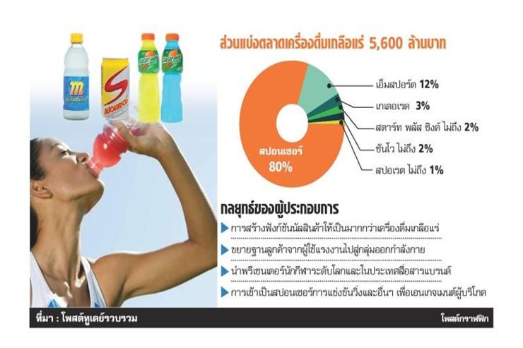 ขณะที่สปอนเซอร์ แม้ว่าจะเผชิญกับความท้าทายจากคู่แข่งหลายแบรนด์ แต่กลยุทธ์ตลาดที่แข็งแกร่ง สร้างให้สินค้าเป็นมากกว่าเครื่องดื่มเกลือแร่ เน้นจุดขายฟังก์ชันนัลของสินค้าจากการเติมสารต่างๆ อาทิ ผสมแอล-คาร์นิทีน และสินค้าใหม่ล่าสุด สปอนเซอร์ บีเฟรช เติมแมกนีเซียม เพื่อขยายฐานลูกค้ากลุ่มวัยทำงาน นอกจากนี้ยังดำเนินกลยุทธ์สปอร์ต มาร์เก็ตติ้งอย่างแข็งแกร่ง ไม่ว่าจะเป็น ผู้สนับสนุนการแข่งขันบาสเกตบอลเยาวชนไทย ส่งผลให้สปอนเซอร์เป็นผู้นำตลาดแบบทิ้งห่างคู่แข่ง