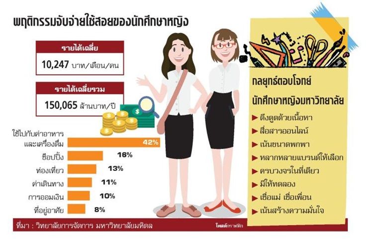 ผลการสำรวจและวิจัยของ วิทยาลัยการจัดการ มหาวิทยาลัยมหิดล พบว่านักศึกษาหญิงระดับมหาวิทยาลัยถือเป็นกลุ่มเป้าหมายที่ผู้ประกอบการและนักการตลาดควรจับตามองทั้งในด้านจำนวนที่เพิ่มขึ้นอย่างต่อเนื่อง โดยในปี 2559 มีจำนวนประมาณ 1.2 ล้านคน เพิ่มขึ้น 12.9% จากปี 2555 ประกอบกับปัจจัยด้านพฤติกรรมการใช้จ่ายที่ตัดสินใจซื้อสินค้าอย่างรวดเร็ว