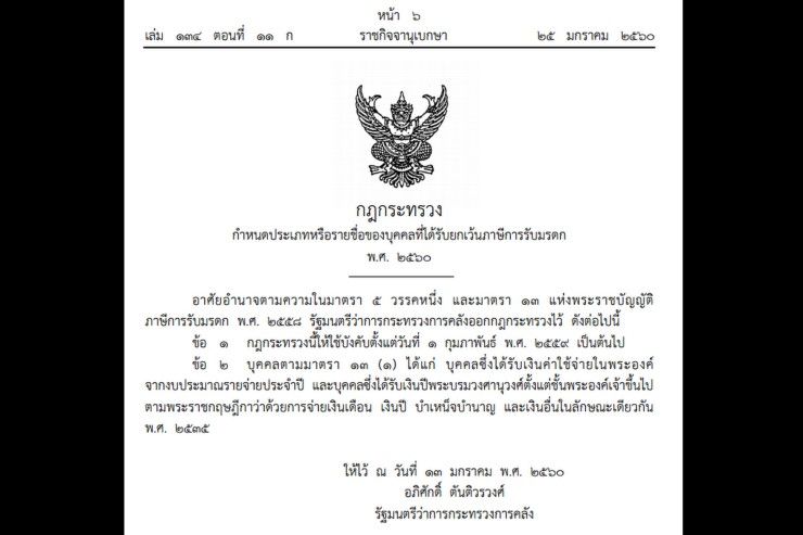 ราชกิจจานุเบกษาประกาศกฎกระทรวงกำหนดประเภทหรือรายชื่อของบุคคลที่ได้รับยกเว้นภาษีการรับมรดก