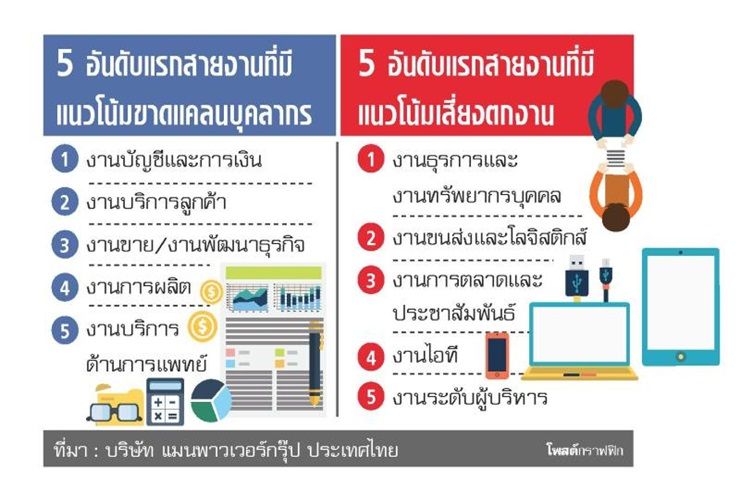สำหรับสายงานเสี่ยงตกงาน มาจากสถาบันการศึกษาผลิตคนมากเกินความต้องการตลาด ได้แก่ งานธุรการ งานทรัพยากรบุคคล งานการตลาดและประชาสัมพันธ์ บางงานหากมีความสามารถทั่วไป ไม่เชี่ยวชาญเฉพาะทางก็เสี่ยงตกงาน เช่น งานไอทีและงานระดับผู้บริหาร อีกส่วนเสี่ยงตกงานเพราะธุรกิจนั้นชะลอตัวตามภาวะเศรษฐกิจ แต่เมื่อเศรษฐกิจดีขึ้นความต้องการสายงานนั้นก็จะมากขึ้นด้วย คืองานขนส่งและโลจิสติกส์