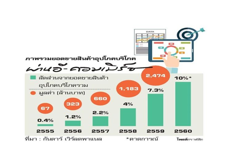 อิษณาติ วุฒิธนากุล ผู้จัดการฝ่ายพัฒนาธุรกิจ บริษัท กันตาร์ เวิร์ลด พาแนล (ไทยแลนด์) กล่าวว่า จากการศึกษาพฤติกรรมการซื้อสินค้าของครัวเรือนไทยผ่านช่องทางอี-คอมเมิร์ซตั้งแต่ปี 2555 ที่ผ่านมาจนถึงปัจจุบันพบว่ามีการปรับตัวเพิ่มขึ้นอย่างต่อเนื่อง เห็นได้จากปี 2555 ที่ผ่านมา การซื้อสินค้าผ่านช่องทางอี-คอม เมิร์ซมีสัดส่วนเพียง 0.4% และมีมูลค่าการซื้อขายอยู่ที่เพียง 67 ล้านบาทเท่านั้น แต่ปัจจุบันมีการปรับตัวเพิ่มขึ้นมาสูงถึง 7.3% หรือมีมูลค่าการซื้อขายอยู่ที่ประมาณ 2,474 ล้านบาท ซึ่งจากแนวโน้มที่ดีดังกล่าวคาดการณ์ว่าปี 2560 นี้ ครัวเรือนไทยจะมีสัดส่วนการซื้อสินค้าผ่านช่องทางอี-คอมเมิร์ซเพิ่มขึ้นเป็น 10% อย่างแน่นอน