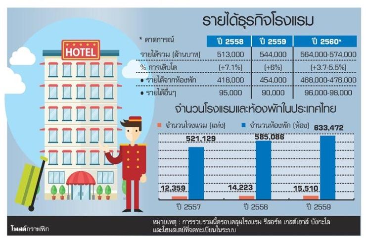 ศูนย์วิจัยกสิกรไทย ประเมินว่า ภาพรวมธุรกิจโรงแรมไทยแข่งขัน รุนแรงขึ้น ทำให้ผู้ประกอบการที่ทำธุรกิจโรงแรมอยู่แล้วขยายธุรกิจอย่างระมัดระวังมากขึ้น แต่ก็ยังมีผู้ประกอบการรายใหม่เข้าสู่ตลาดต่อเนื่อง เพื่อรองรับสถานการณ์ท่องเที่ยวปีนี้ที่มีแนวโน้มดีขึ้น ตลาดการจัดงานในโรงแรมฟื้นตัว โดยการเข้ามามีทั้ง รูปแบบเข้าซื้อกิจการ ควบรวมธุรกิจกับโรงแรมที่มีอยู่แล้วในตลาด และลงทุนสร้างโรงแรมแห่งใหม่เอง กลุ่มที่เข้ามาในธุรกิจนี้มีทั้งผู้ประกอบการอสังหาริมทรัพย์ และธุรกิจอื่นที่เป็น กลุ่มทุนใหญ่ เช่น พลังงาน ค้าปลีก