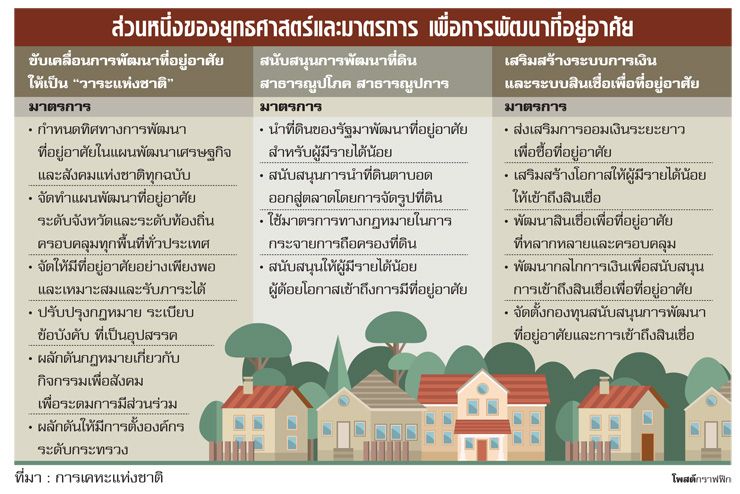 รัฐบาลกำลังเดินหน้าวางยุทธศาสตร์การพัฒนาที่อยู่อาศัย 20 ปี ตั้งแต่ปี 2560-2579 เป็นเสมือนพิมพ์เขียวในการพัฒนาที่อยู่อาศัยในระยะยาวอย่างบูรณาการ แม้จะต้องเริ่มจากศูนย์ เพราะที่ผ่านมาประเทศไทยยังไม่เคยมีการวางยุทธศาสตร์การพัฒนาที่อยู่อาศัยอย่างเป็นเรื่องเป็นราว มีเพียงหน่วยงานที่เกี่ยวข้องอย่างการเคหะแห่งชาติที่มีการพัฒนาที่อยู่อาศัยให้กับผู้มีรายได้น้อยตามกำลังความสามารถที่มีอยู่ ซึ่งการขับเคลื่อนยุทธศาสตร์ภายใต้อำนาจที่มีอยู่เต็มมือของรัฐบาล ทำให้พอมองเห็นโอกาสและเส้นทางที่จะเดินไปสู่เป้าหมายที่วางไว้ได้