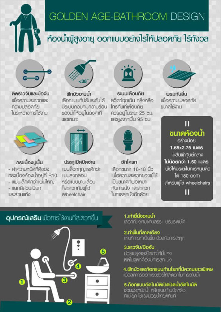 โดย...โฮมโปรห้องน้ำถือเป็นอีกหนึ่งห้องที่มีความเสี่ยงให้เกิดเหตุอันตรายได้ง่ายๆ โดยเฉพาะกับผู้สูงอายุ การออกแบบห้องน้ำสำหรับผู้สูงอายุ ถือเป็นช่วงวัยที่ต้องได้รับการดูแลและใส่ใจไม่ต่างจากเด็กๆ พื้นที่สำคัญอย่างห้องน้ำจึงต้องได้รับการออกแบบให้ปลอดภัยและพร้อมใช้งานในทุกช่วงเวลา ไม่ต้องกังวลถึงอันตรายที่จะเกิดขึ้น ด้วยการคิดและออกแบบอย่างรอบคอบกันเสียตั้งแต่ต้น องค์ประกอบการออกแบบที่ไม่ควรมองข้ามพื้นที่ภายในห้องน้ำผู้สูงอายุ ควรมีขนาดกว้างxยาว อย่างน้อย 1.65x2.75 เมตร และมีเส้นผ่าศูนย์กลางไม่น้อยกว่า 1.50 เมตร เพื่อให้มีระยะในการหมุนตัวได้ 180 องศา สำหรับผู้ใช้ Wheelchairs แบ่งสัดส่วนการใช้งานเป็น 3 ส่วน คือ ส่วนอ่างล้างหน้า ส่วนชักโครก ส่วนอาบน้ำติดตั้งอุปกรณ์จำเป็นติดราวจับและมือจับในส่วนต่างๆ เพื่อให้ระหว่างการใช้งานผู้สูงอายุสามารถเคลื่อนที่ได้สะดวกและปลอดภัย รวมถึงฝักบัวอาบน้ำ ควรเลือกเป็นแบบที่ปรับระดับได้ตามความสูงของผู้ใช้งานและมีระบบควบคุมความร้อนของน้ำให้อยู่ในองศาที่พอเหมาะ และไม่ลืมที่จะปูพรมกันลื่นในส่วนอาบน้ำและอ่างอาบน้ำขนาดของชักโครกที่เหมาะสมเลือกใช้ชักโครกขนาด 16-18 นิ้ว เพื่อความสะดวกของผู้ใช้
