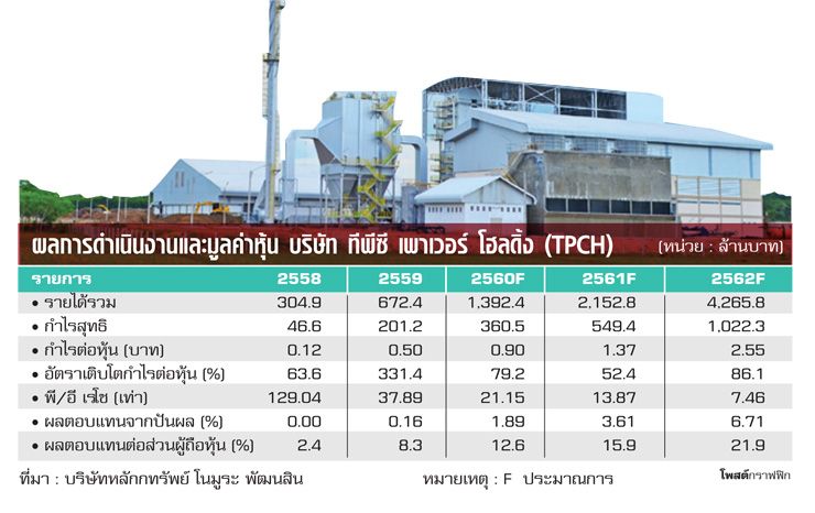 โดย...พูลศรี เจริญจุดเริ่มธุรกิจโรงไฟฟ้าชีวมวลของบริษัท ทีพีซี เพาเวอร์ โฮลดิ้ง (TPCH) เกิดจากวิสัยทัศน์ของ เจริญ จันทร์พลังศรี ผู้ก่อตั้งบริษัท ไทยโพลีคอนส์ (TPOLY) ประกอบธุรกิจรับเหมาก่อสร้าง และปัจจุบันรับงานก่อสร้างโรงไฟฟ้าให้ TPCH ทุกโครงการ โดยเจริญได้เริ่มปักหมุดโรงไฟฟ้าชีวมวลที่ จ.นครศรีธรรมราช ตั้งแต่ปี 2549 ปัจจุบันถือเป็นบริษัทที่มีฐานธุรกิจโรงไฟฟ้าชีวมวลที่แข็งแกร่งในภาคใต้การเข้าจดทะเบียนในตลาดหลักทรัพย์เอ็ม เอ ไอ (mai) เดือน ม.ค. 2558 ทำให้ TPCH ได้เงินทุนมาขยายธุรกิจและผลการดำเนินงานเติบโตต่อเนื่อง “กนกทิพย์ จันทร์พลังศรี” ประธานกรรมการบริหาร TPCH กล่าวว่า บริษัทได้เงินจากการเสนอขายหุ้นต่อประชาชนครั้งแรก (ไอพีโอ) 1,140 ล้านบาท มาขยายธุรกิจจนเติบโตถึงทุกวันนี้ โดยก่อนนำกิจการเข้าจดทะเบียนมีสัญญาซื้อขายไฟฟ้า (พีพีเอ) จำนวน 60-70 เมกะวัตต์ ค่าก่อสร้าง 75 ล้านบาท/เมกะวัตต์ ขณะที่ปัจจุบันมีพีพีเอ 130 เมกะวัตต์“เงินที่ได้จากไอพีโอ รวมกับกระแสเงินสดในมือ 600-700 ล้านบาท ทำให้มีเงินทุนเพียงพอสำหรับพัฒนาโรงไฟฟ้าได้ 150 เมกะวัตต์”นอกจากธุรกิจเติบโตต่อเนื่องแล้ว หุ้น TPCH ยังได้รับ