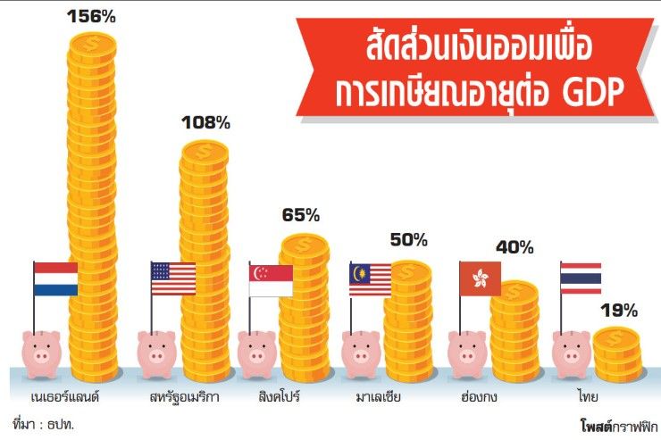 เมื่อเปรียบเทียบสัดส่วนเงินออมเพื่อการเกษียณ ต่อผลิตภัณฑ์มวลรวมภายในประเทศ (จีพีดี) พบว่าประเทศไทยมีสัดส่วนเพียง 19% ในขณะที่ประเทศเนเธอร์แลนด์มีสัดส่วนเงินออมสูงมากถึง 156% สหรัฐอเมริกา 108% สิงคโปร์ 65% มาเลเซีย 50% และฮ่องกง 40%