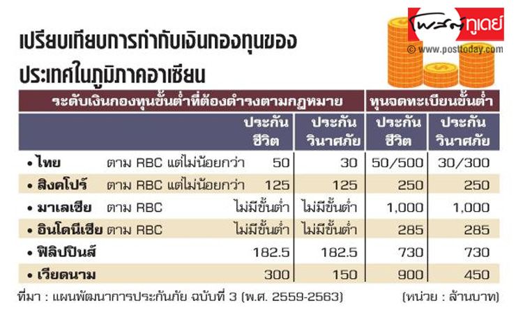 ธุรกิจประกันภัยในประเทศไทยมีระดับเงินกองทุนขั้นต่ำที่ต้องดำรงตามกฎหมายอยู่ในระดับต่ำเมื่อเทียบกับประเทศอื่นในภูมิภาคอาเซียน