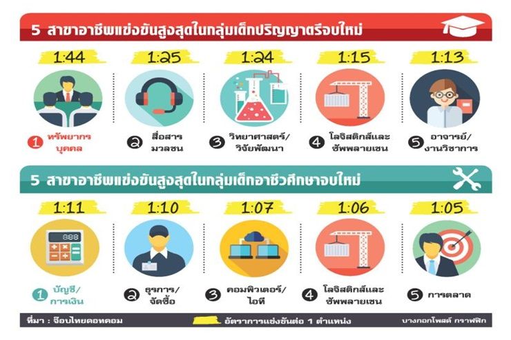 ขณะที่อาชีพอันดับ 1-5 โดยรวมยังไม่เปลี่ยนแต่อาจสลับลำดับกัน ซึ่งอันดับ 1 ของกลุ่มปริญญาตรีจบใหม่คือธุรการและจัดซื้อ 15.3% ของการสมัครทั้งหมด เพราะแทบทุกองค์กรมีตำแหน่งนี้ และองค์กรเปิดรับผู้ที่จบจากทุกสาขามาทำ ส่วนอันดับ 1 ของอาชีวศึกษา จบใหม่ คือ ช่างเทคนิค 23.3%