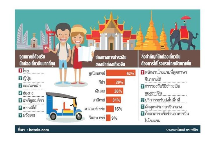 ข้อมูลเหล่านี้สะท้อนศักยภาพของนักท่องเที่ยวจีนที่ผู้ประกอบการไม่ควรมองข้าม ยิ่งไทยติดอันดับ 1 ประเทศที่ต้อนรับนักท่องเที่ยวจีนมากที่สุดในสายตานักท่องเที่ยวจีน ยิ่งต้องรีบตอบโจทย์เพื่อคว้าตลาดนี้ให้ได้ โดยสิ่งที่นักท่องเที่ยวจีนต้องการจากโรงแรม คือ พนักงานที่พูดภาษาจีนกลางได้ การรองรับช่องทางการชำระเงินของคนจีน เช่น ยูเนียนเพย์ หรืออาลีเพย์ ซึ่งเป็นความต้องการ 2 อันดับต้นๆ ที่ครองอันดับต่อเนื่องจากปีก่อน