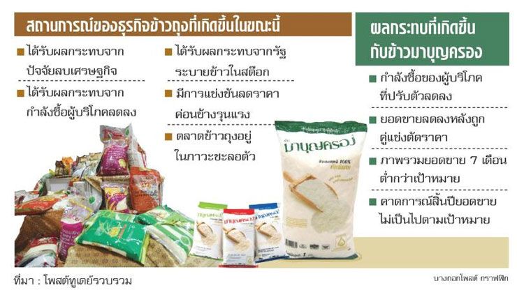 สมเกียรติ มรรคยาธร กรรมการผู้จัดการใหญ่ บริษัท ปทุมไรซมิล แอนด์ แกรนารี ผู้ผลิตและจัดจำหน่ายข้าวสารบรรจุถุงตราข้าวมาบุญครอง และกลุ่มธุรกิจ เอ็ม บี เค ฟู้ด โซลูชั่น ผู้ดำเนินธุรกิจร้านสุกี้นัมเบอร์วันและร้านอาหารญี่ปุ่นฮินะ กล่าวว่า ภาพรวมของตลาดข้าวถุงในปีนี้มีการแข่งขันกันค่อนข้างรุนแรง โดยเฉพาะในเรื่องของราคาขาย เนื่องจากกำลังซื้อของผู้บริโภคลดลง ส่งผลให้พฤติกรรมการซื้อข้าวถุงของผู้บริโภคมีการเปลี่ยนแปลงไป คือ หันมาซื้อข้าวถุงที่ราคาถูกลงจากเดิม