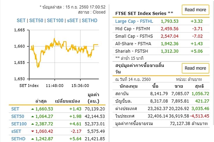 ตลาดหลักทรัพย์แห่งประเทศไทย ปิดการซื้อขายภาคบ่ายประจำวันที่15ก.ย.60 ดัชนีเคลื่อนไหวที่ระดับ 1,660.53จุด เปลี่ยนแปลง +1.43จุด มูลค่าการซื้อขาย 70,139.20 ล้านบาท
