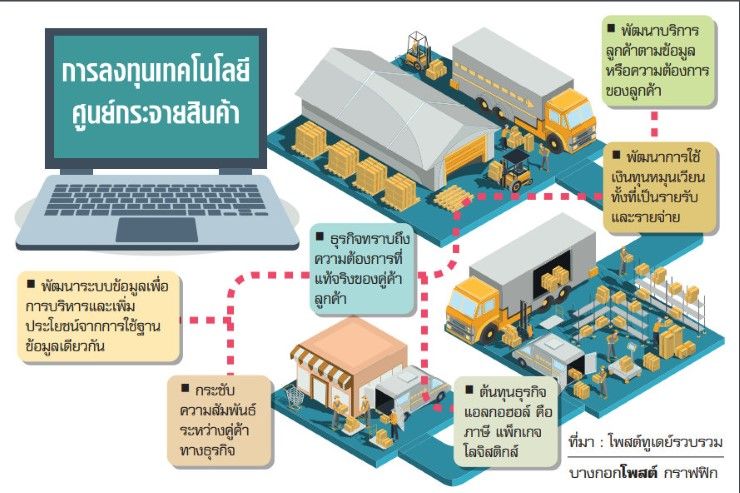 ทั้งนี้ การสร้างศูนย์กระจายสินค้าอัจฉริยะ บริษัทจะนำเทคโนโลยีเข้ามาบริหารจัดการระบบทั้งหมด ภายใต้ระบบออโตเมชั่นและการใช้บิ๊กดาต้ามาทำการเชื่อมโยง ทั้งจากฝ่ายโรงงานในเครือที่มีทั้งหมดมากกว่า 36 โรงงาน ได้แก่ โรงงานสุรา 18 แห่ง โรงงานผลิตเบียร์ 3 แห่ง โรงงานเสริมสุข 13 แห่ง โรงงานโออิชิ 2 แห่ง เป็นต้น นอกจากนี้ยังมีคลังสินค้า 70 แห่งทั่วประเทศ และเอเยนต์หรือตัวแทนจำหน่ายเครื่องดื่มแอลกอฮอล์และปราศจากแอลกอฮอล์รายใหญ่ 3,000 ราย เชื่อมโยงกับศูนย์กระจายสินค้าที่จะสร้างขึ้น 19 แห่ง