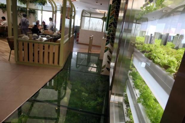 มีแปลงผักไฮโดรโปนิกส์ สาธิตการปลูกตั้งแต่ระดับแรกจนถึงผักโตพร้อมเก็บ เป็นแปลงประดับตกแต่งบริเวณทางเข้าร้าน และภายในร้านยังมีทางเดินกระจกที่เบื้องล่างจำลองเป็นสวนป่า ให้บรรยากาศเสมือนเดินเข้าไปในสวน