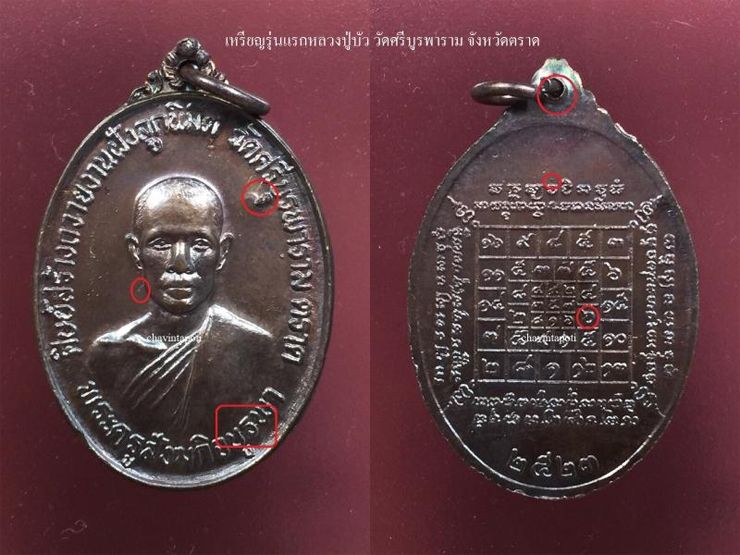 หลวงปู่บัว ถามโก วัดศรีบูรพาราม จ.ตราด วันนี้ชมพระเครื่องสายภาคตะวันออกที่ครบเครื่องทั้งด้านแคล้วคลาด เมตตามหานิยม มีประสบการณ์เป็นที่กล่าวขวัญของนักสะสม ชมเหรียญรุ่นแรกหลวงปู่บัววัดศรีบูรพาราม จ.ตราด บล็อกแก้มขีด หรือหูขีด จุดสังเกตของบล็อกนี้จะมีเส้นเนื้อเกินขีดทแยงข้างแก้มใต้หูด้านขวาองค์พระ และอีกจุดคำว่า กิจบูรพา จะมีเส้นเกินลากจากด้านบนของ (จ) ทแยงลงผ่านใต้ (บ) และ (ร)ไปชนที่ด้านล่าง (พ)