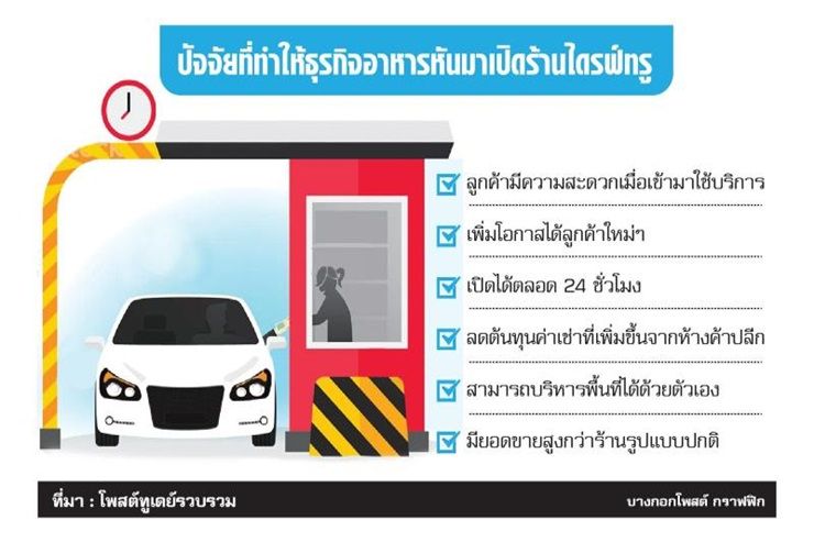 ความสะดวกสบายที่ลูกค้าได้รับ ดังกล่าว ส่งผลให้ร้านอาหารในรูปแบบไดรฟ์ทรูได้รับความนิยมเพิ่มขึ้นอย่างต่อเนื่อง และจากผลการตอบรับที่ดี ทำให้ผู้ประกอบการร้านอาหารฟาสต์ฟู้ดเล็งเห็นโอกาสหันมาขยายสาขาในรูปแบบไดรฟ์ทรูกันมากขึ้น เนื่องจากสาขาในรูปแบบดังกล่าวสามารถสร้างยอดขายได้มากกว่าสาขาทั่วไปประมาณ 3-4% เพราะสามารถเปิดให้บริการได้ตลอด 24 ชั่วโมง