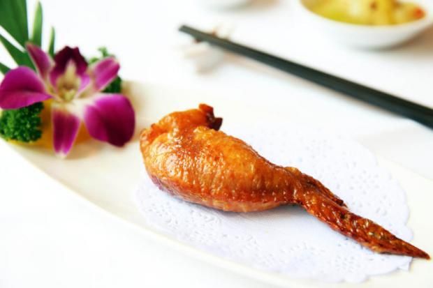 จานถัดมาเป็นปีกไก่ยัดไส้ข้าวเหนียวทอด สูตรกวางตุ้ง วิธีทำจะตัดหรือเลาะกระดูกไก่ออกเสียก่อนแล้วยัดด้วยไส้ข้าวเหนียวปรุงรส ถือเป็นเมนูโบราณมาแต่เก่าที่หากินยาก ร้านอาหารจีนหลายร้านสมัยนี้จะเห็นว่าไม่มีแล้ว ด้วยทำยากและต้องใช้เวลาในการทำนานนั่นเอง