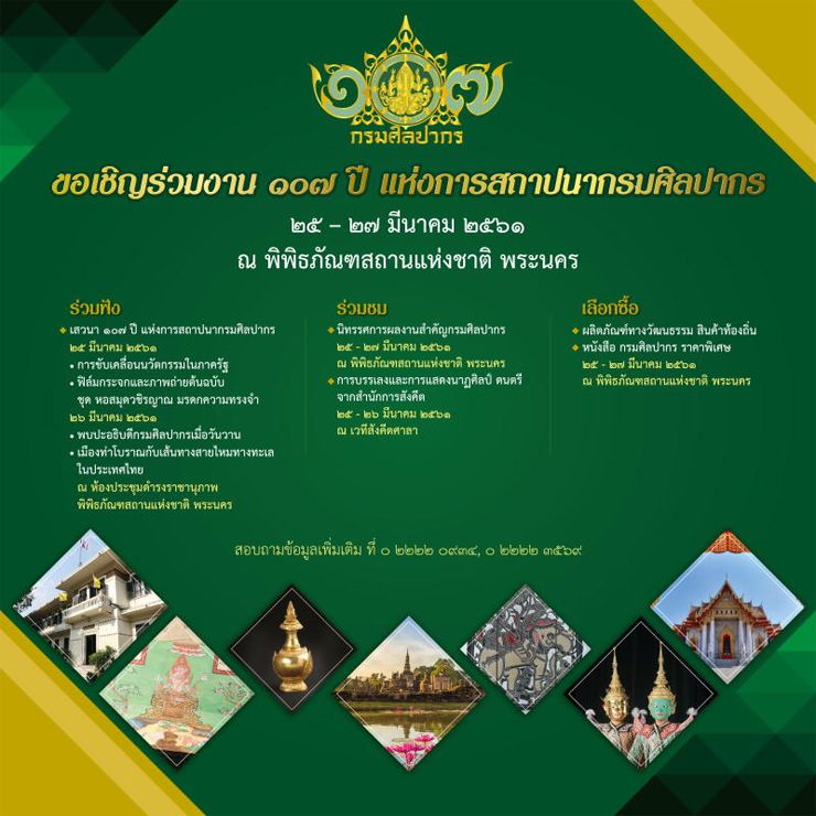ช่วงเวลานี้ไม่มีเรื่องประวัติศาสตร์และวัฒนธรรมอันใดที่ติดปาก ชินหูประชาชนคนไทยมากกว่า ละครประวัติศาสตร์เรื่อง บุพเพสันนิวาส ที่กำลังฮิตทางทีวีช่อง 3 จึงเห็นข่าวที่ผู้คนออกเที่ยวชมโบราณสถานใน จ.พระนครศรีอยุธยา เพิ่มขึ้นเป็นประวัติการณ์ ความดังของละครก็มาสอดคล้องกับวันเกิด 107 ปี ของกรมศิลปากร วันที่ 27 มี.ค. 2561 เข้าพอดี ซึ่งทางกรมศิลปากรจัดงานตั้งแต่วันที่ 25 มี.ค. โดยเชิญชวนประชาชนคนไทยให้เข้าชมความหลากหลายและความภูมิใจในประวัติศาสตร์ ที่เป็นรากเหง้าของตน โดยจัดนิทรรศการ “แผ่นดินไทยในอดีต” นิทรรศการของหน่วยงานในสังกัดกรมศิลปากร พร้อมด้วยการเสวนา การออกร้าน Creative Fine Arts ระหว่างวันที่ 25-27 มี.ค. 2561 ณ พิพิธภัณฑสถานแห่งชาติ พระนคร