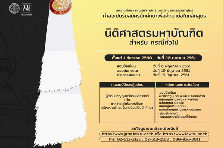 คณะนิติศาสตร์ มหาวิทยาลัยธรรมศาสตร์ กำลังเปิดรับสมัครบุคคลเพื่อเข้าศึกษาต่อในหลักสูตรระดับบัณฑิตศึกษา