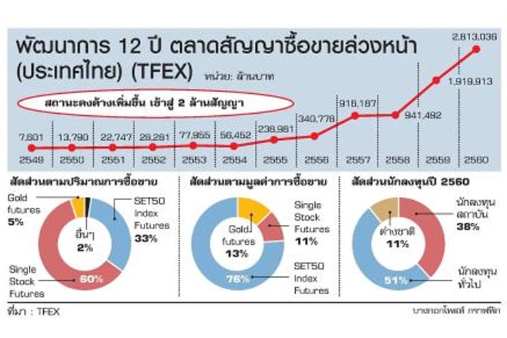 ขณะเดียวกัน ปัจจุบันสถานะคงค้างของ TFEX เมื่อปี 2560 สูงถึง 2.81 ล้านสัญญา หรือเพิ่มขึ้นจากช่วงเดียวกันของปีก่อนถึง 1 ล้านสัญญา เป็นการสะท้อนให้เห็นว่าผู้ลงทุนมีการถือสัญญามากขึ้น เพื่อทำกำไรและใช้บริหารความเสี่ยงมากขึ้น ถือเป็นการเติบโตอย่างยั่งยืนกว่าในอดีต