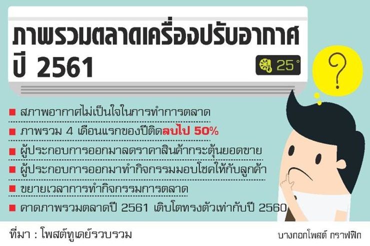 จากปัญหาฝนที่ยังคงตกอย่างต่อเนื่องตั้งแต่ก้าวเข้าสู่หน้าร้อนในช่วงเดือนมี.ค.ที่ผ่านมา ส่งผลให้ภาพรวมตลาดเครื่องปรับอากาศมีอัตราการเติบโตไม่เป็นไปอย่างที่คาดการณ์กันไว้ว่าสิ้นปี 2561 นี้ภาพรวมตลาดเครื่องปรับอากาศจะกลับมาเติบโตได้อีกครั้งที่ประมาณ 10% หลังจากปี 2560 ที่ผ่านมาติดลบไปประมาณ 10%
