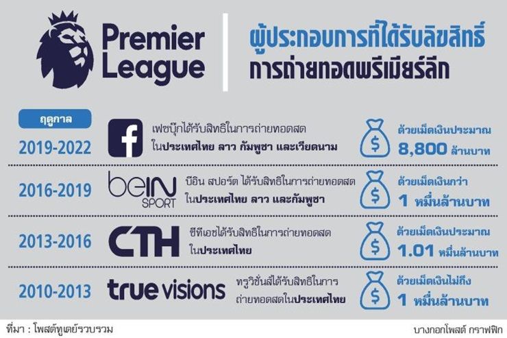 เฟซบุ๊กทุ่มเงินกว่า 265 ล้านดอลลาร์สหรัฐ เป็นเจ้าของลิขสิทธิ์ถ่ายทอดสดการแข่งขันฟุตบอลพรีเมียร์ลีกอังกฤษในไทย ลาว กัมพูชา และเวียดนาม