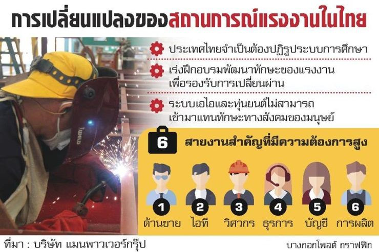 สุธิดา กาญจนกันติกุล ผู้จัดการฝ่ายการตลาด บริษัท แมนพาวเวอร์ กรุ๊ป ประเทศไทย ระบุว่า นับจากนี้ 5 ปี การเปลี่ยนแปลงของระบบหุ่นยนต์และเอไอจะมีบทบาทชัดเจนขึ้น อาจส่งผล ต่อแรงงานกึ่งฝีมือ แต่สิ่งที่จะเข้ามาแทนที่แรงงานมนุษย์ไม่ได้ คือ ทักษะด้านสังคม การสื่อสาร การเขียน การพูด และการแก้ปัญหา ดังนั้นแรงงานไทยจึงจำเป็นต้องเร่งพัฒนาฝีมือ เพื่อก้าวสู่การเป็นแรงงานที่เหมาะสม (Right Person)