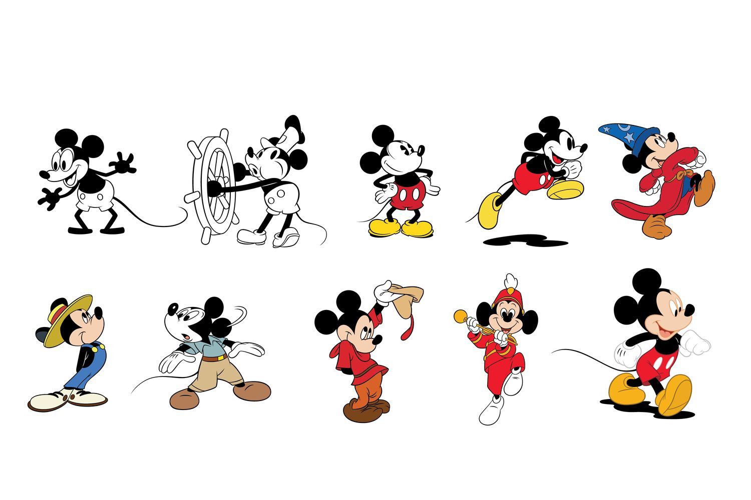 มิกกี้ เมาส์ ตัวการ์ตูนที่มีนิ้วข้างละ 4 นิ้ว ได้เปลี่ยนแปลงรูปลักษณะหลายครั้ง เขาสวมถุงมือสีขาวครั้งแรกใน When the Cat’s Away (1929) และพูดว่า “ฮอตด็อก!” เป็นคำแรกใน The Karnival Kid (1929) ต่อมา มิกกี้ เมาส์ ถูกดีไซน์ใหม่โดย เฟรด มัวร์ ก่อนเปิดตัวกับ The Pointer (1939) แล้วจึงมีคิ้วเพิ่มเข้ามาอย่างที่เห็นครั้งแรกใน Pluto’s Party (1952) ปี 1990 มิกกี้ เมาส์ ก็ได้ก้าวเข้าสู่โลกของการ์ตูนจากคอมพิวเตอร์กราฟฟิกเต็มตัว