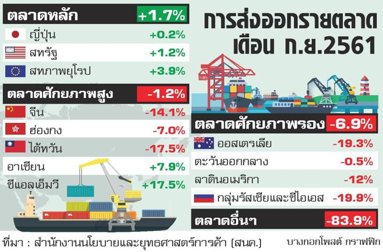 บรรจงจิตต์ อังศุสิงห์ อธิบดีกรมส่งเสริมการค้าระหว่างประเทศ กล่าวว่า ตัวเลขการส่งออกเดือน ก.ย. 2561 ไม่น่าประหลาดใจ เพราะมีหลายกลุ่มสินค้าที่ได้รับผลกระทบของสงครามการค้า แต่ก็ยังมีผลกระทบในเชิงบวกที่จะต้องหาโอกาสผลักดันการส่งออกไทยให้ขยายตัวในกลุ่มที่ไทยมีศักยภาพ เช่น กลุ่มอาหารและเกษตรแปรรูป โดยคาดว่าปี 2561 จะเติบโต 8% มูลค่า 2 หมื่นล้านดอลลาร์ สิ่งที่ต้องเร่งทำคือการเพิ่มมูลค่าให้สินค้าอาหารและเกษตรแปรรูปที่ต้องใช้นวัตกรรมเพื่อส่งออกไปสหรัฐและตลาดซีแอลเอ็มวี รวมถึงตะวันออกกลาง รวมถึงสินค้าไลฟ์สไตล์ที่มีโอกาสส่งออก ซึ่งจะต้องทำแบรนด์สินค้าขึ้นมาในกลุ่มนี้