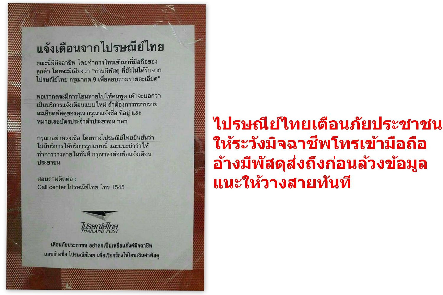 ไปรษณีย์ไทยเตือนภัยมิจฉาชีพโทรเข้ามือถือลูกค้าหลอกล้วงข้อมูลส่วนตัว