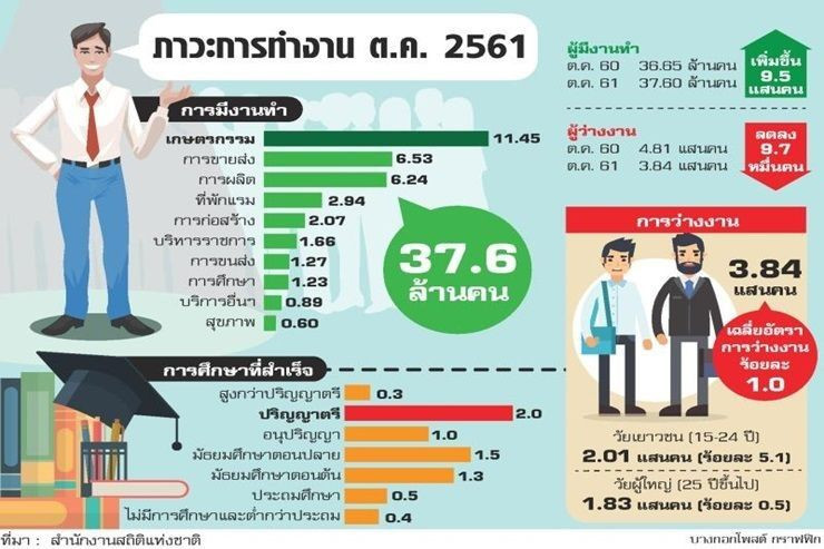สำนักงานสถิติแห่งชาติ (สสช.) รายงานผลสำรวจภาวะการทำงานของคนไทยเดือน ต.ค. 2561 ระบุว่า แนวโน้มการจ้างงานมีสัญญาณที่ดีขึ้น โดยพบว่ามีผู้มีงานทำจำนวน 37.6 ล้านคน เพิ่มขึ้นจากช่วงเดียวกันปีก่อน 9.5 แสนคน ขณะที่การว่างงานนั้นมีจำนวนอยู่ที่ 3.84 แสนคน คิดเป็นอัตราการว่างงาน 1% ลดลง 9.7 หมื่นคน เมื่อเทียบกับช่วงเดียวกันปีก่อน แต่หากเทียบกับเดือนก่อนหน้า การว่างงานเพิ่มขึ้น 1.1 หมื่นคน