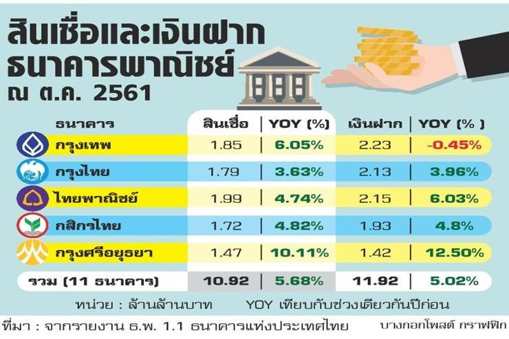 นอกจากนี้ ธปท.เปิดเผยรายการย่อแสดงสินทรัพย์และหนี้สินของธนาคารพาณิชย์ ณ วันที่ 31 ต.ค. 2561 สินเชื่อ-เงินฝากรวมของระบบธนาคารพาณิชย์ไทยเดือน ต.ค. 2561 ยังขยายตัว โดยสินเชื่อรวมในระบบอยู่ที่ 10.923 ล้านล้านบาท เพิ่มขึ้น 5.68% ขณะที่เงินฝากมีจำนวนรวม 11.926 ล้านล้านบาท เพิ่มขึ้น 5.02% ทั้งนี้สินเชื่อที่เพิ่มขึ้นยังคงเป็นสินเชื่อธุรกิจ และสินเชื่อรายย่อยโดยเฉพาะสินเชื่อเช่าซื้อขยายตัวตามยอดขายรถในประเทศ แต่สินเชื่อเอสเอ็มอี ชะลอตัวลงเนื่องจากธนาคารยังกลัวปัญหาคุณภาพสินทรัพย์