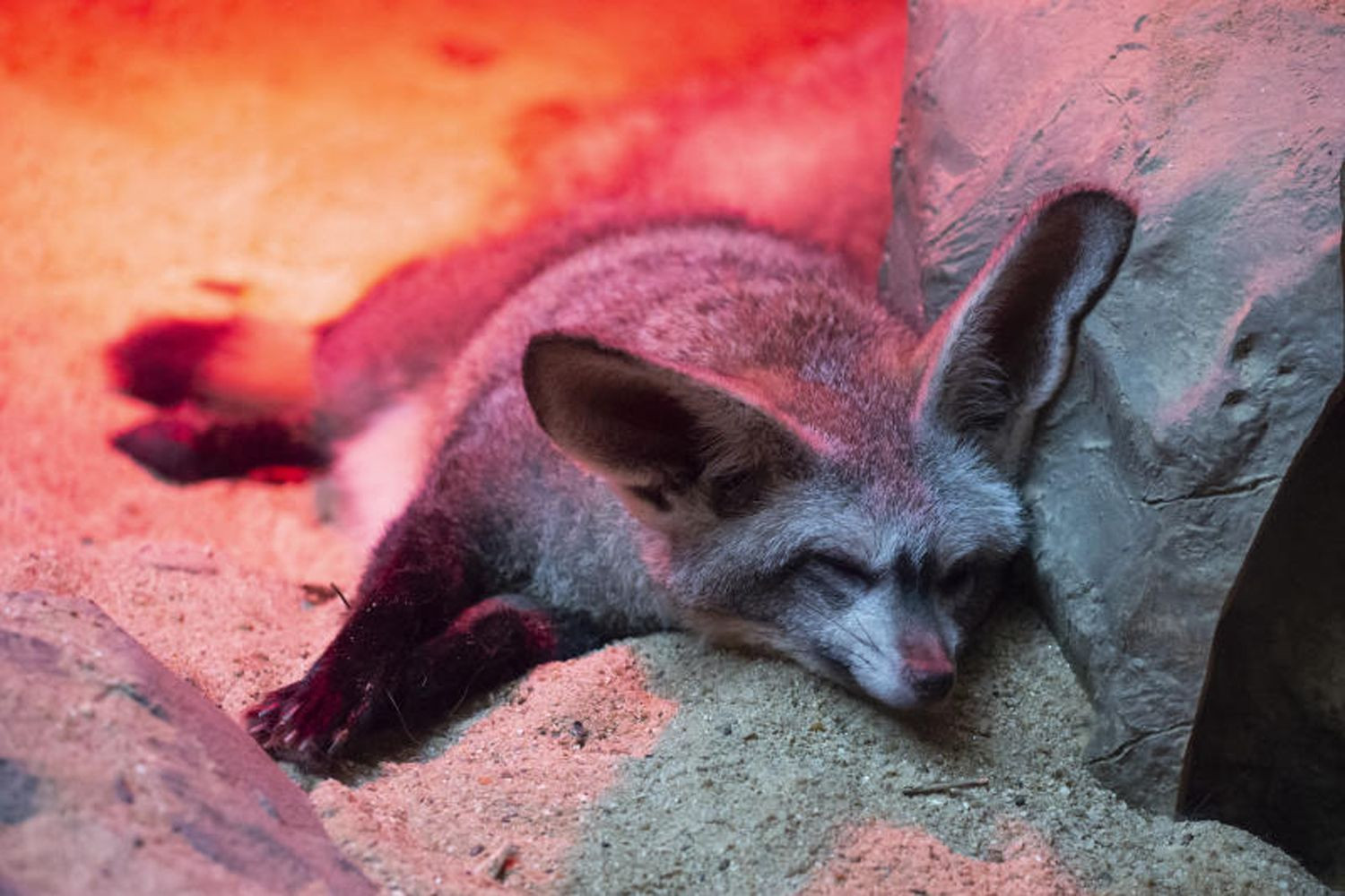 โซนที่ผมชอบมากๆ ของสวนสัตว์เขาดินก็คือ บ้านสัตว์หากินกลางคืน (Nocturnal House) ก็ผมเองเป็น FC ของสัตว์เล็กสัตว์น้อยที่หากินกลางคืนเป็นทุนเดิมอยู่แล้วเมื่อมาเจออาคารรวมสัตว์กลางคืนไว้ด้วยกันโดยสร้างบรรยากาศในนั้นให้เหมือนกลางคืนด้วย นี่มันสวรรค์ชัดๆ (อย่างน้อย ก็พวกที่มีรสนิยมแบบผมละนะ) เอาเข้าจริง ผมประทับใจตั้งแต่ป้ายเลยทีเดียว ทำออกมาได้น่ารักมากโซนสัตว์กลางคืนเป็นจุดสุดท้ายของผม ในการบันทึกภาพสัตว์เขาดิน มาถึงก็ใกล้ 6 โมงเย็นเข้าไปแล้ว ข้างในทางเดินมืดสลัว ส่วนของกรงสัตว์ยิ่งสลัวหนัก มีแค่แสงสีเหลืองเหี่ยวๆ เห็นตัวสัตว์ลางๆ สัตว์ขาประจำก็เป็นพวกชะมดอีเห็นทั้งหลาย ซึ่งเวลานั้นก็ยังไม่ตื่นจากหลับ ยังคงซุกอยู่ตามซอกตามโพรงมีไม่กี่ชนิดที่เห็นตัวชัดพอจะถ่ายรูปได้ แต่ก็ต้องดัน iso ขึ้นไปถึง 6400 และต้องใช้สปีดต่ำด้วย อย่างนางอายหรือลิงลม และพญากระรอกบินหูแดง (ชื่อพี่เข้ม) ใครจะตะเกียกตะกายไปเดินพรมแดงเมืองคานส์อย่างไร พี่เข้มไม่สนใจ เอาแต่นอนหลับสบายบนพรมแดงเมืองเขา (ดิน)! แต่สัตว์ที่ผมชอบที่สุดในโซนนี้ คือ Bat-eared Fox หรือจิ้งจอกหูค้างคาว จากแอฟริกา มันหลับบนพื้นทรายคล้ายอยู่ในถิ่นกำเนิด มีไฟสีแดงส่องให้ความอบอุ่นคือเห็นหน้าเจ้านี่ปุ๊บ ผมก็รู้สึกปั๊บว่า ในบรรดาหมาในป่าทั้งหลายในโลกนี้ จิ้งจอกหูค้างคาวมีหน้าตาเป็นเอกลักษณ์โดนใจ เหนือกว่าหมาใดๆ ใบหูใหญ่ผิดส่วนของมัน ยาวถึง 5 นิ้ว ใช้ทำประโยชน์หลายสถาน ไม่ว่าจะใช้ควบคุมอุณหภูมิร่างกาย ใช้ฟังเสียงเหยื่อ ซึ่งเหยื่อหลักก็คือ ปลวก นอกจากนี้ ยังใช้หูส่งสัญญาณแสดงอารมณ์ต่างๆ ให้สมาชิกในครอบครัวได้รู้ คงคล้ายๆ การตีสัญญาณธงลูกเสือฟันของจิ้งจอกหูค้างคาว ไม่เหมือนฟันหมาจิ้งจอกอื่นๆ มีรูปทรงเล็ก แหลม คมจัด ใช้สำหรับบดขยี้ปลวก โดยมีกล้ามเนื้อพิเศษ ช่วยให้เคี้ยวได้รวดเร็วเหลือเชื่อ คือ 5 ครั้งต่อวินาที! ย้อนไปถึงตอนย่างเท้าเข้าไปในบ้านสัตว์กลางคืน ช่วงนั้นผู้คนสลายตัวไปจากเขาดินแทบหมดแล้ว มีผมอยู่คนเดียว บรรยากาศวังเวง หลอนๆ ดีแท้นี่ถ้าจู่ๆ มีมัมมี่โผล่พรวดออกมาจากหลืบกำแพง หรือแดร็กคูล่าเด้งดึ๋งขึ้นมาจากโลง แบบบ้านผีสิงที่แดนเนรมิต ผมจะไม่แปลกใจเลยสักนิด!