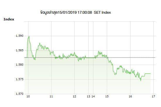 เมื่อวันที่ 15 ม.ค.62 ตลาหุ้นไทยเคลื่อนไหวทั้งในแดนบวก-ลบ ก่อนปิดช่วงบ่ายที่ระดับ 1,577.00 จุด ลดลง 5.57 จุด (-0.35%) มูลค่าการซื้อขาย 37,956.54 ล้านบาท โดยดัชนีฯแตะจุดสูงสุดที่ 1,590.15 จุด และแตะจุดต่ำสุดที่ระดับ 1,574.37 จุด