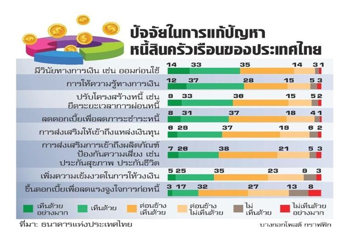 สำหรับปัจจัยที่ครัวเรือนคิดว่าจะสามารถแก้ปัญหาหนี้ครัวเรือนได้ดี คือ การมีวินัยของครัวเรือนเอง การได้รับความรู้ทางการเงินและการปรับโครงสร้างหนี้ ส่วนปัจจัยรองลงมาคือ การลดดอกเบี้ยเพื่อลดภาระในการชำระหนี้ การส่งเสริมการเข้าถึงหนี้ในระบบ และการเข้าถึงเครื่องมือการป้องกันความเสี่ยงของครัวเรือน เช่น การทำประกันสุขภาพ เป็นต้น