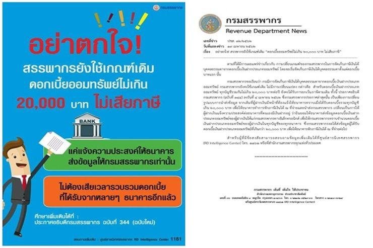 กรมสรรพากร ออกหนังสือชี้แจงระบุว่า ตามที่ได้มีการเผยแพร่เกี่ยวกับ การเปลี่ยนเกณฑ์ของกรมสรรพากรในการจัดเก็บภาษีเงินได้บุคคลธรรมดาจากดอกเบี้ยเงินฝากประเภทออมทรัพย์ โดยจะเริ่มจัดเก็บภาษีเงินได้บุคคลธรรมดาตั้งแต่ดอกเบี้ยบาทแรกนั้น