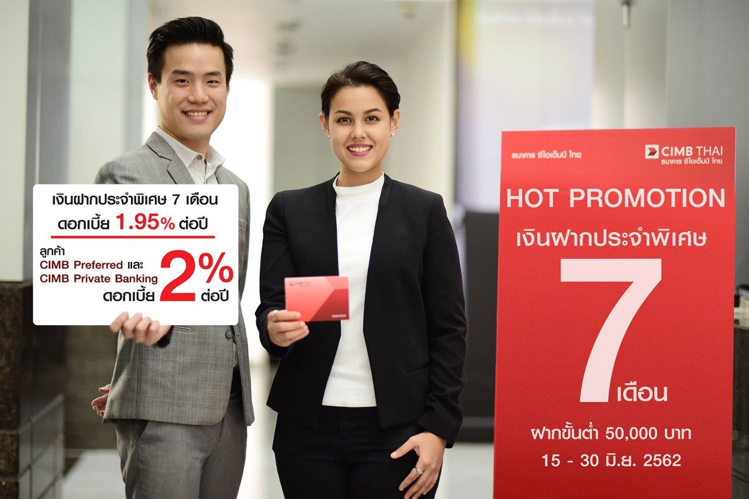 ธนาคาร ซีไอเอ็มบี ไทย ได้ออกโปรแกรมเงินฝากประจำพิเศษ 7 เดือน ดอกเบี้ย 1.95% ต่อปี และพิเศษสำหรับลูกค้า CIMB Preferred และ CIMB Private Banking ดอกเบี้ย 2% ต่อปี นับเป็นทางเลือกที่น่าสนใจมากสำหรับลูกค้าฝากเงินไว้กับโปรแกรมอื่นและใกล้ครบกำหนด หรือลูกค้าที่ต้องการพักเงินในระยะสั้นถึงระยะกลางเพื่อรอติดตามสภาวะตลาด โดยได้รับอัตราดอกเบี้ยที่สูงคุ้มค่า